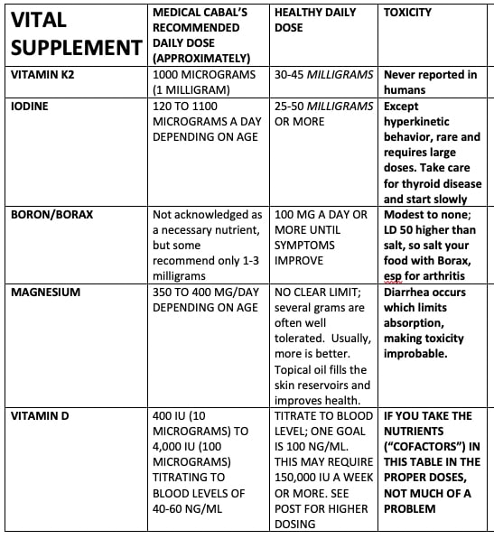 Dietary iodine, vitamin K2, magnesium, boron, and vitamin D are now inadequate in the developed world. Taking just enough iodine to avoid goiter or just enough vitamin D to prevent rickets is NOT optimal. The patterns of suppression of these nutrients are evidence of a coordinated effort to destroy our health.