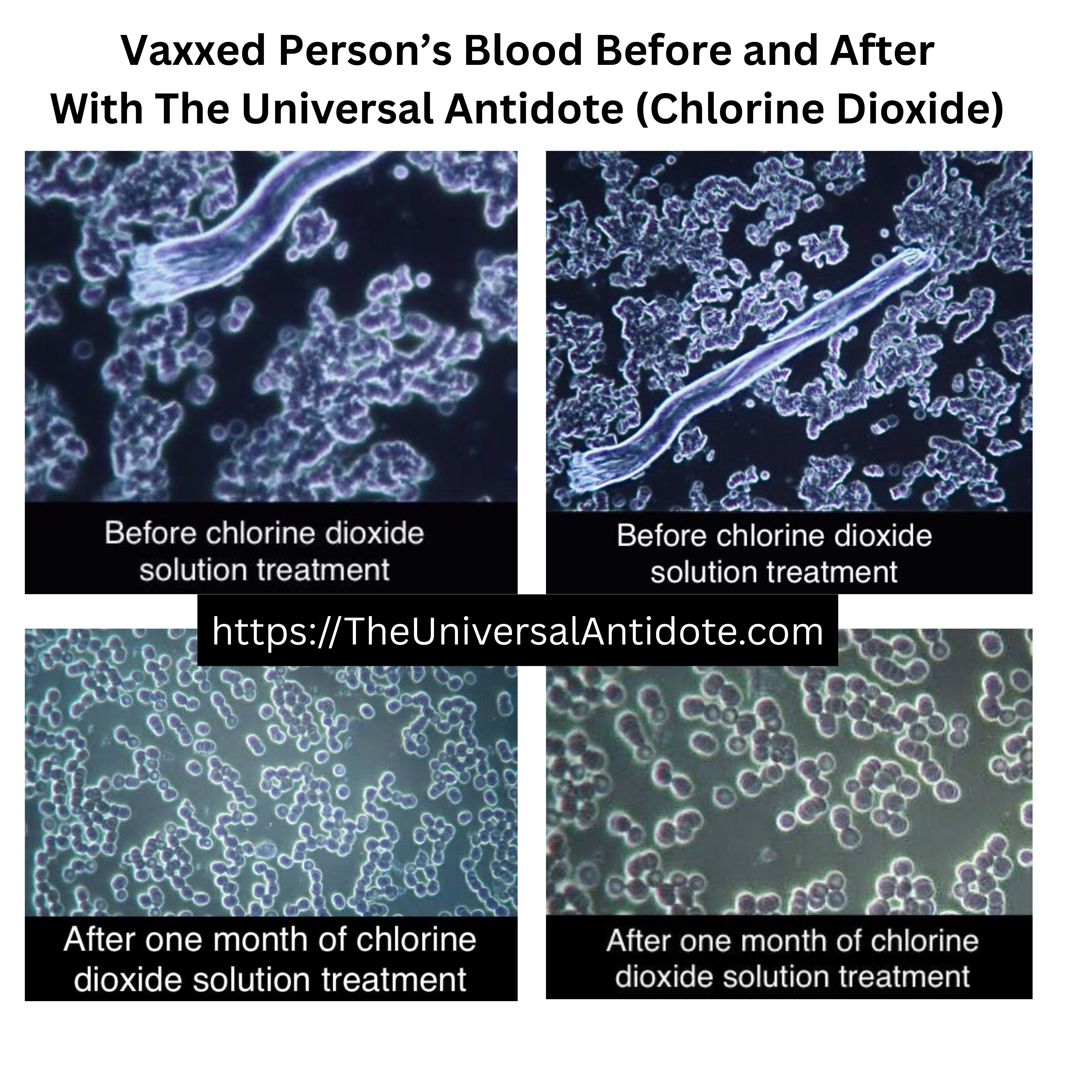 “Photomicrographs at 2000x magnification of my own live blood two hours before and after ingesting chlorine dioxide solution to self-treat infection by SARS-CoV-2 (the biologically engineered virus that was used to implement the tyrannical agenda of the COVID-1984 pLandemic). CDS rapidly and significantly reduced the severity and duration of symptoms and restored blood cells to their normal appearance. Oxygen levels stabilized (before CDS = 90% SpO2 average with 15-30 second troughs at 80% at 5 minute intervals; after CDS = normalized at 98% with peaks at 100%). October 2025.”